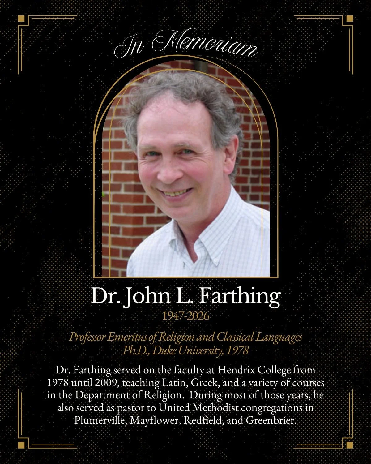 “The Hendrix community is saddened by the passing of Dr. John Farthing on January 8, 2026. Dr. Farthing served as Professor of Religion and Classical Languages at Hendrix College from 1978 to 2009.