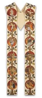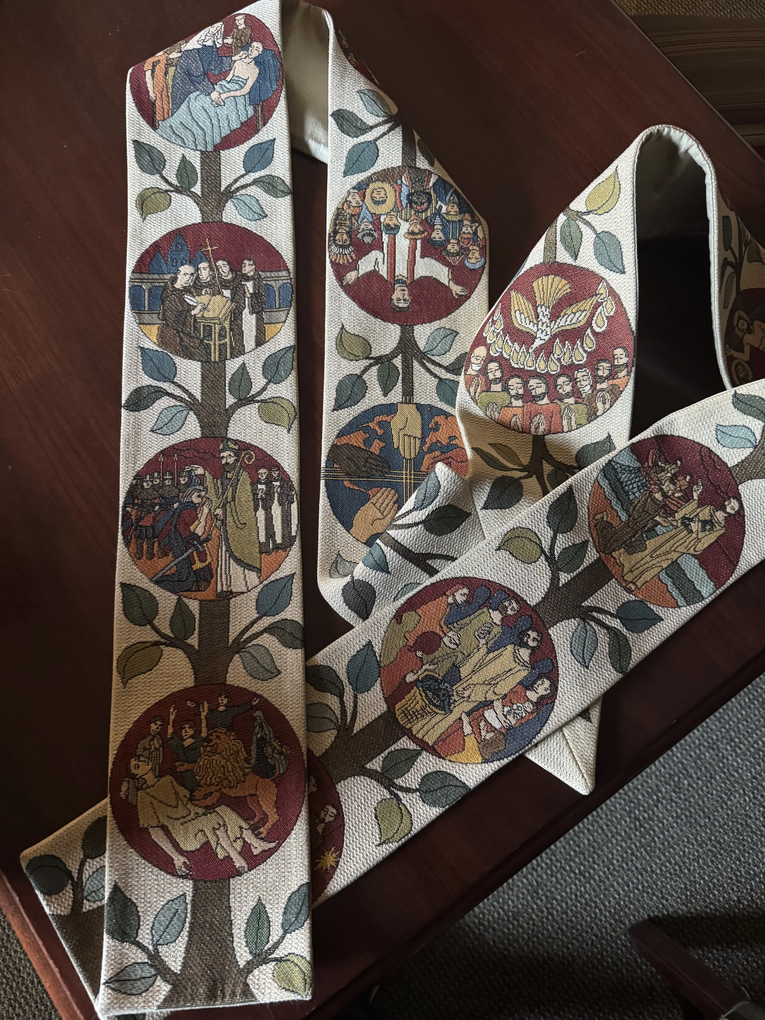 I think of a tapestry, like this clerical stole tapestry (this one is titled “History of the church “- very apropos), where every once in a while you notice a gold thread that seems to poke out from nowhere, sprinkled like a bit of glitter catching the light. But those of you who sew know better, because if we were to open this tapestry up and look beneath the surface, we would see a vast maze of gold thread. It runs underneath the whole design of the tapestry, unbroken, holding the pattern together. John experienced Grace like that, as the gold thread interwoven throughout the whole tapestry of creation. For John, faith was not primarily about mastering doctrine, but about receiving grace. John could teach Aristotelian vs Platonic realism through the writings of Thomas Aquinas or Augustine, and they might quibble with my metaphor. But John, for all the research and learning and teaching about the heights and depths of Christian theology over the generations, (learning that sank into the bones of many in this chapel,) for all the creeds and catechisms, John’s passion, his wonder and awe, could also be as childlike as the children on Jesus’ knee in Matthew 18.